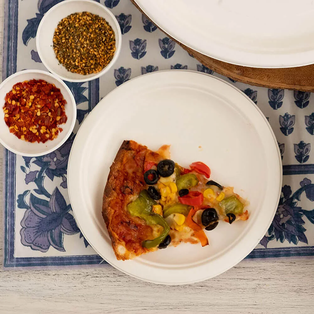 Leafarms Round Plate are the perfect alternative to paper, plastic, and styrofoam tableware. This Eco-Dinnerware is handcrafted from Bagasse which is recycled sugarcane fibre, which is gathered, cleaned and heat pressed and the process uses no chemicals or waxes.